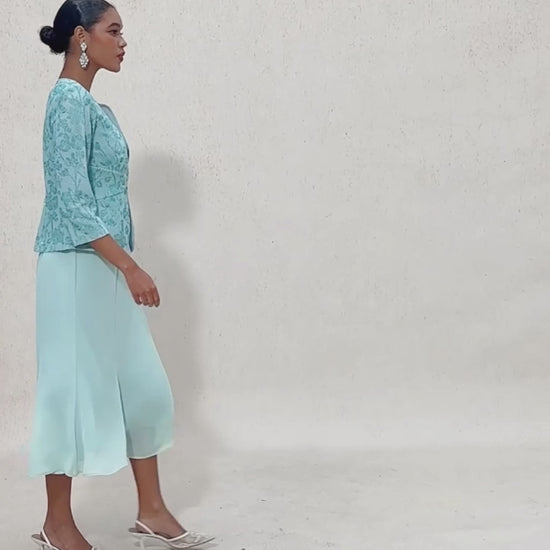 - Design: Floral Embellished Jacket, Sleeveless Dress, Diamond Button Fastening