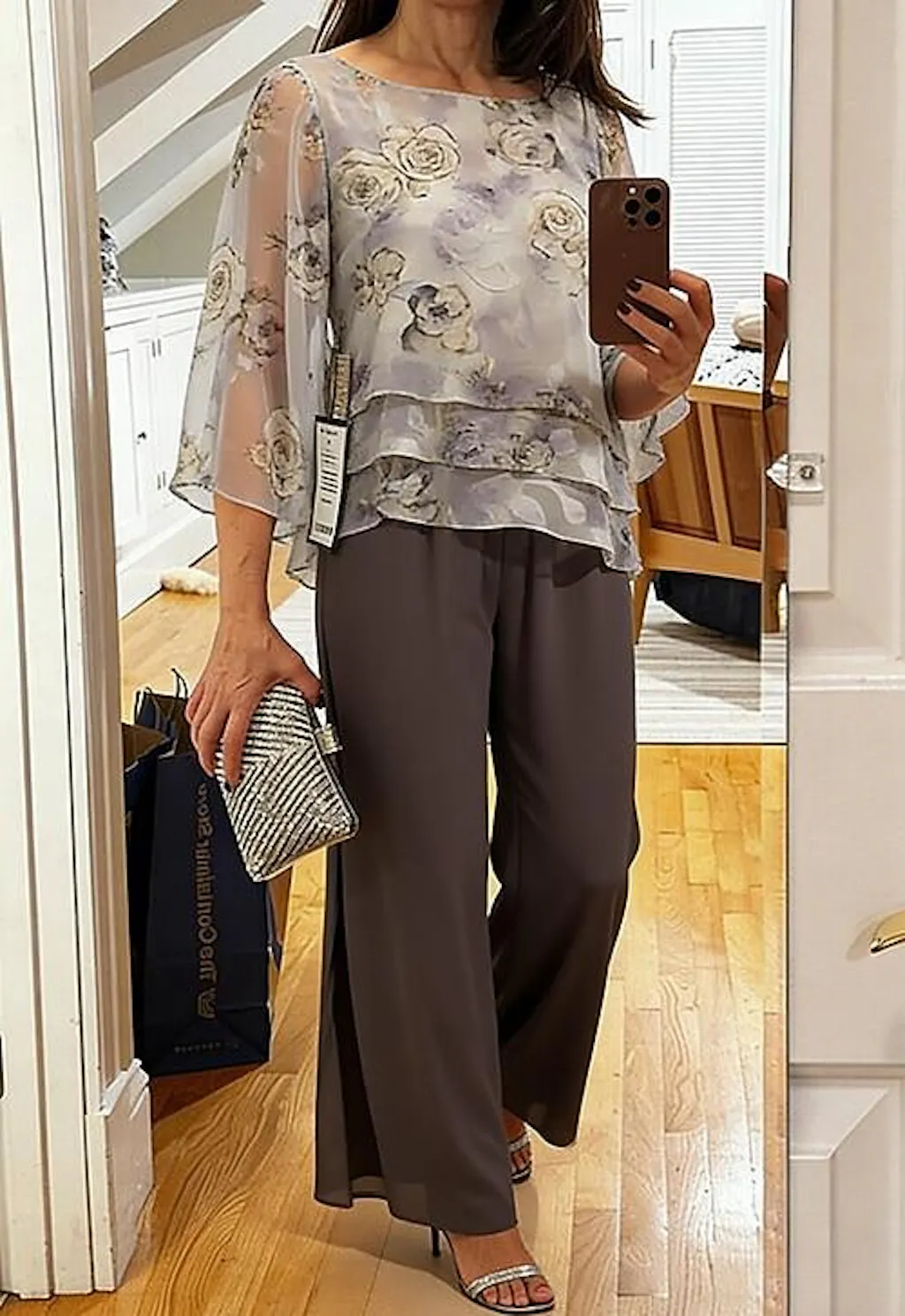 This elegant round neck top features a beautiful floral print that adds a feminine touch to your wardrobe. The layered hem design creates a graceful flow, while the lace chiffon fabric adds texture and sophistication. The 3/4 bell sleeves provide a stylish flair, and the soft knit lining ensures comfort throughout the day. Perfect for any occasion, this top pairs beautifully with ivory chiffon pants, creating a chic and refined look. Whether you're attending a wedding guest, cocktail party, this top is a versatile and elegant addition to your collection.