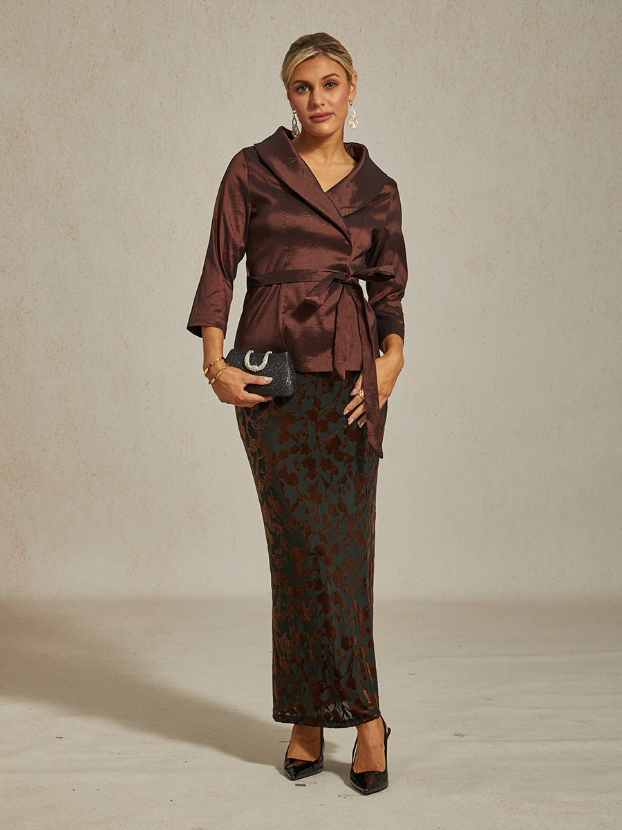 This long velvet skirt showcases a floral texture and a graceful fishtail back detail, offering both movement and sophistication. The elastic waist provides a comfortable and flexible fit, making it suitable for extended wear. Ideal for formal gatherings, evening events, or stylish special occasions.