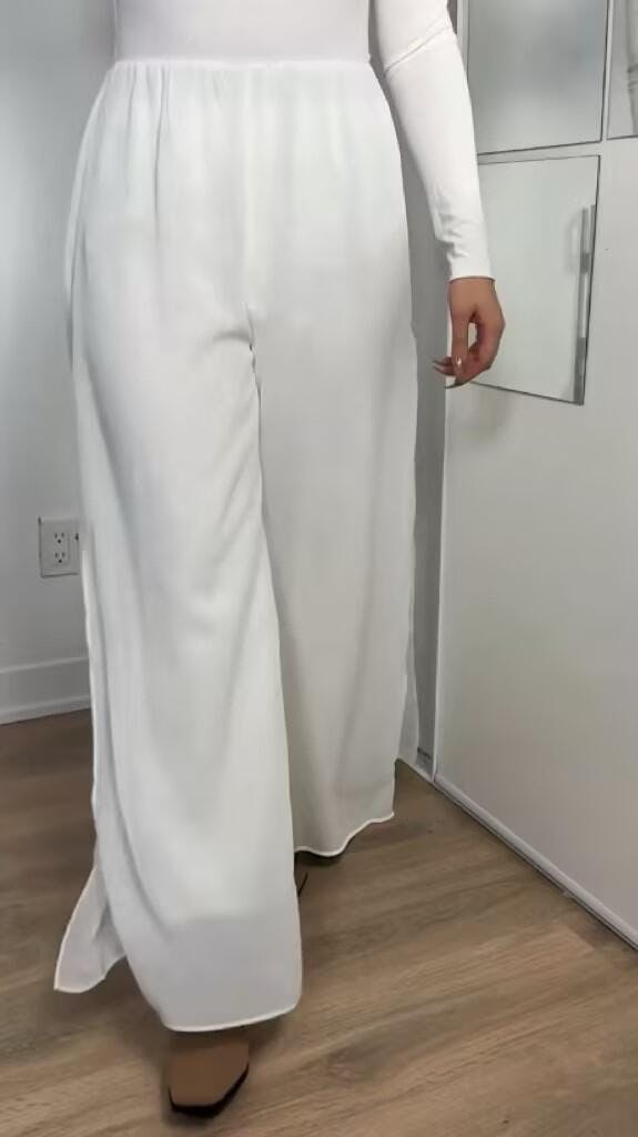 Step into effortless elegance with these straight-leg pants featuring a flowing chiffon split-leg overlay. The design combines comfort and sophistication, with a soft, high-stretch lining for all-day wear. The sheer chiffon overlay adds graceful movement and a touch of drama a perfect for evening events, weddings, banquets, or upscale dinners. Pair them with heels for a refined look, or dress them down with flats for daytime chic.