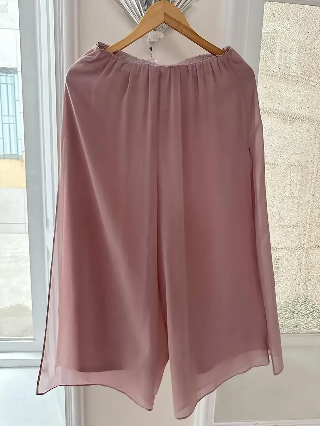 Step into effortless elegance with these straight-leg pants featuring a flowing chiffon split-leg overlay. The design combines comfort and sophistication, with a soft, high-stretch lining for all-day wear. The sheer chiffon overlay adds graceful movement and a touch of drama a perfect for evening events, weddings, banquets, or upscale dinners. Pair them with heels for a refined look, or dress them down with flats for daytime chic.