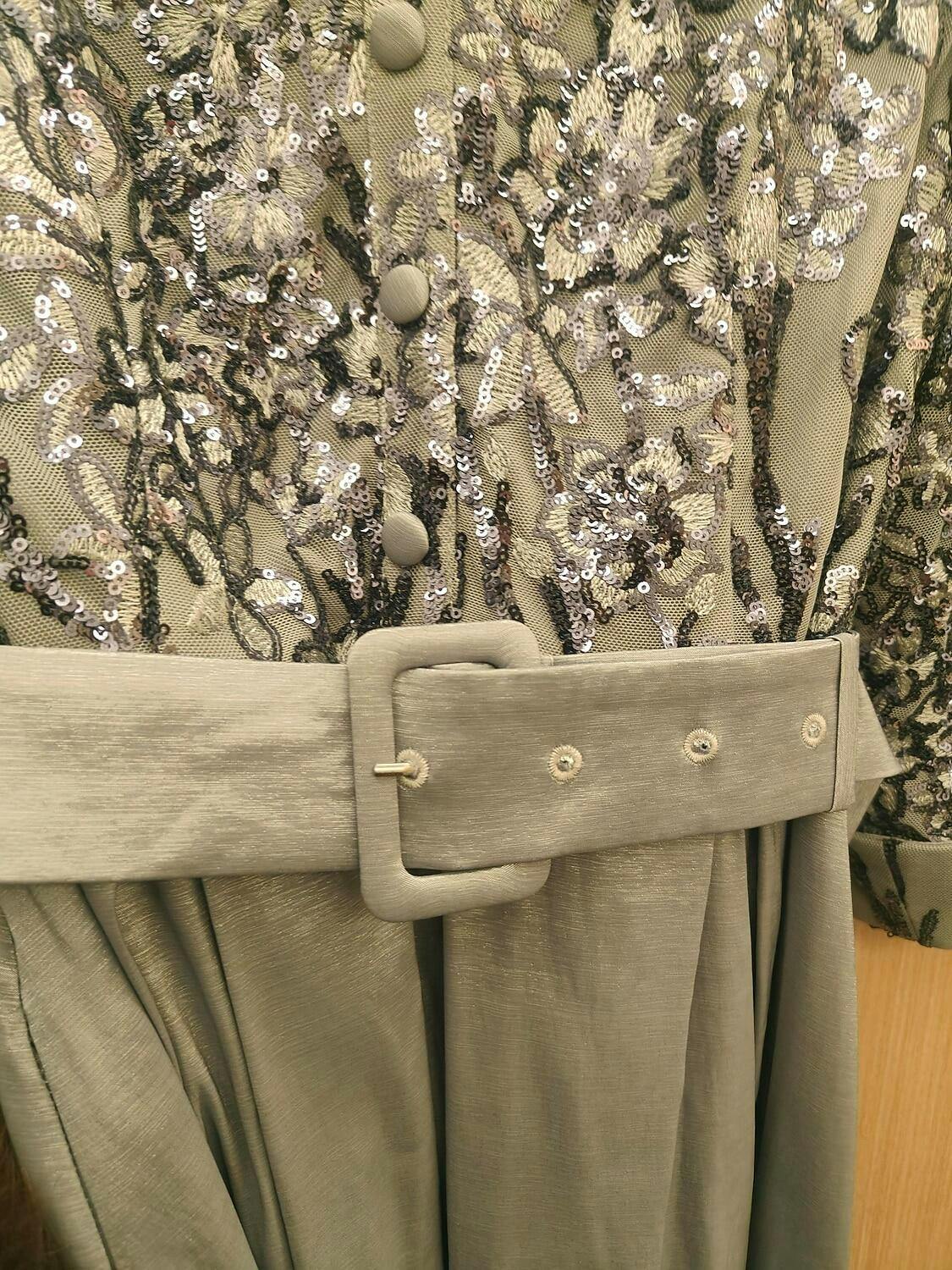 Design: A-line silhouette, paisley sequin embroidered bodice, front opening, back zipper, side pockets, detachable belt, floor-length skirt