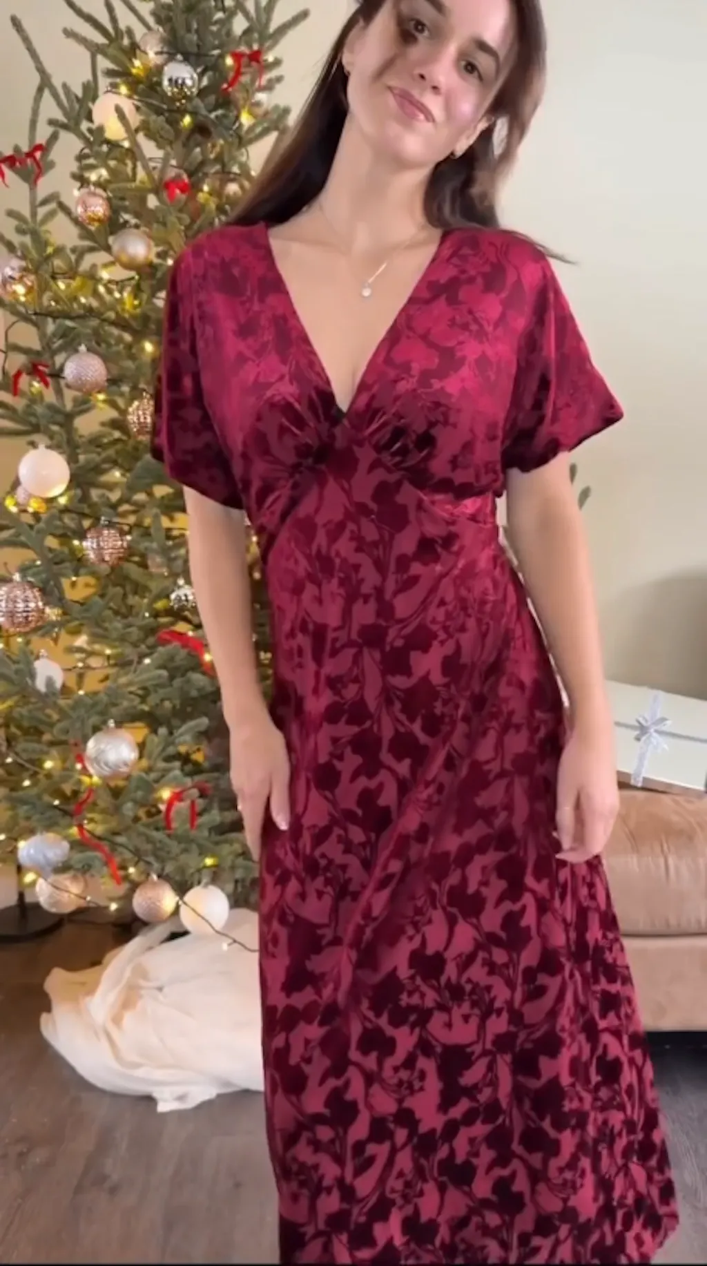 Beautiful dress with a rich velvet feel. The floral pattern adds depth, and the fit is both flattering and comfortable.