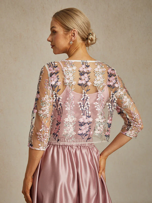 Floral Embroidered Lace Jacket with Rhinestone Button