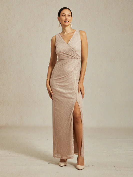 Metallic Pleated Chiffon V-Neck Maxi Dress
