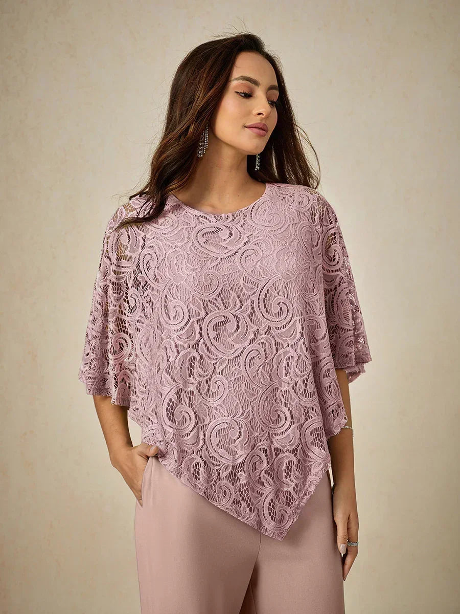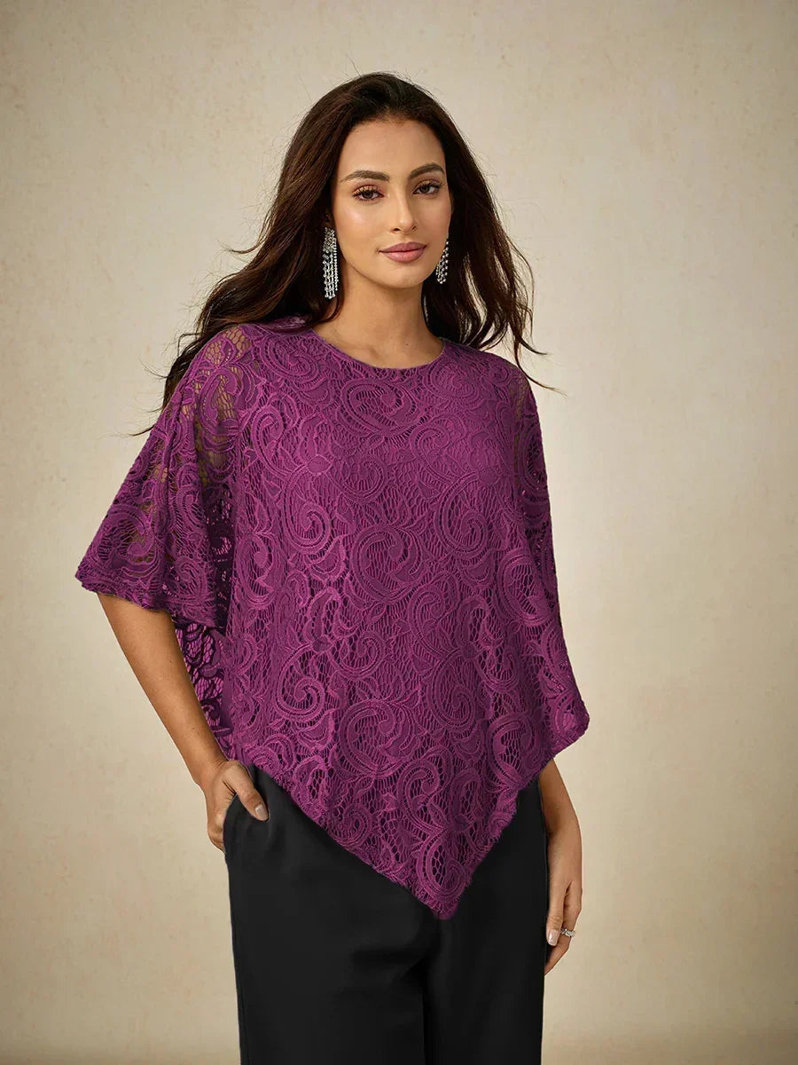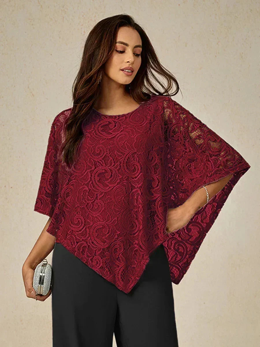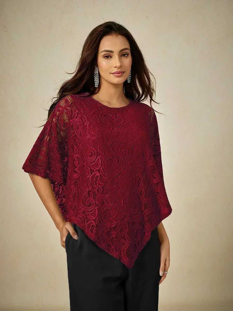 這款輕盈蕾絲上衣採用寬鬆剪裁,配有蝙蝠袖半袖及精緻的蕾絲圖案。設計上採用經典的圓領與寬鬆版型,兼具舒適與優雅。清新的色調非常適合春夏季節,無論搭配同色褲裝或休閒造型皆宜。理想用於日間外出、休閒聚會或半正式場合