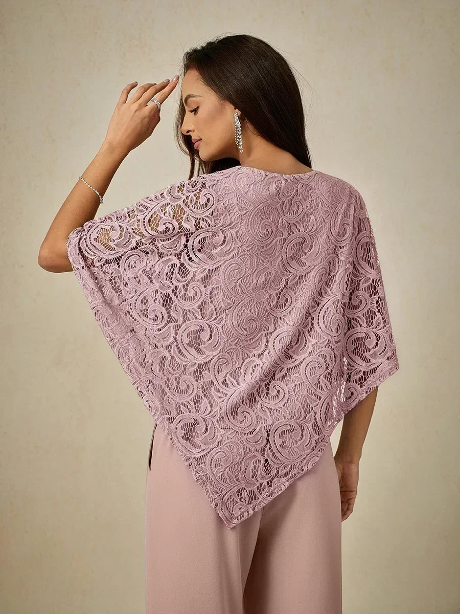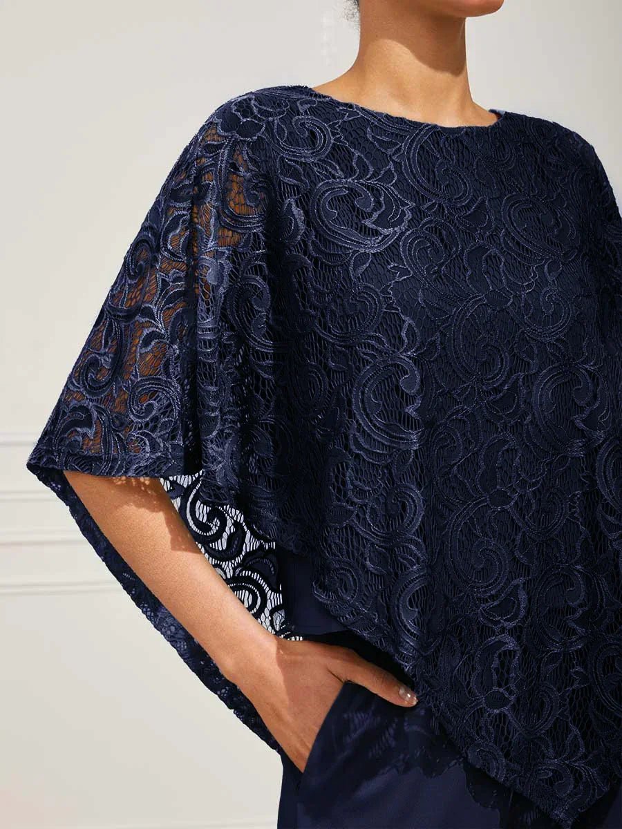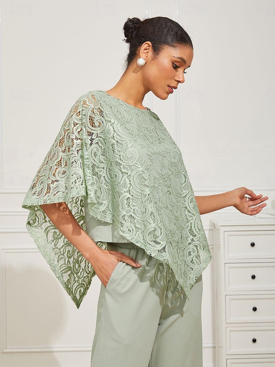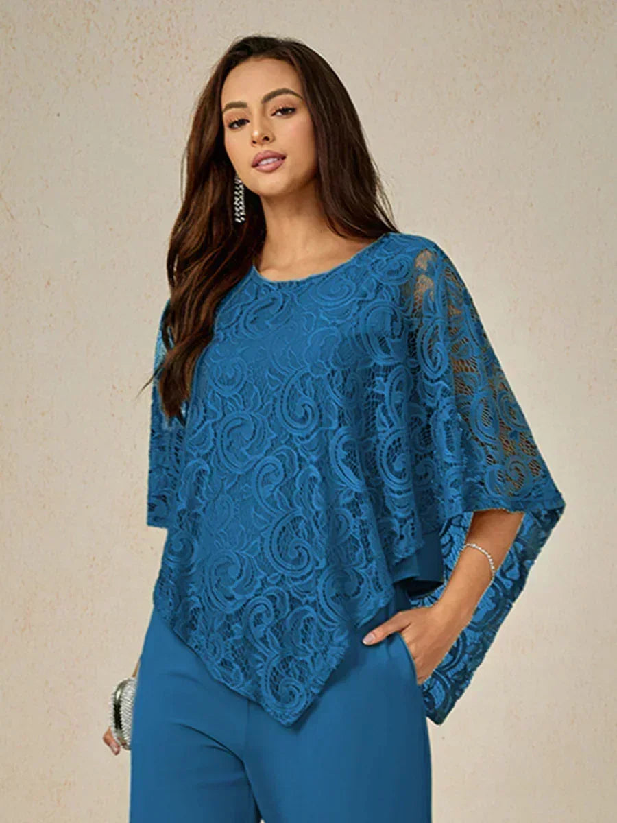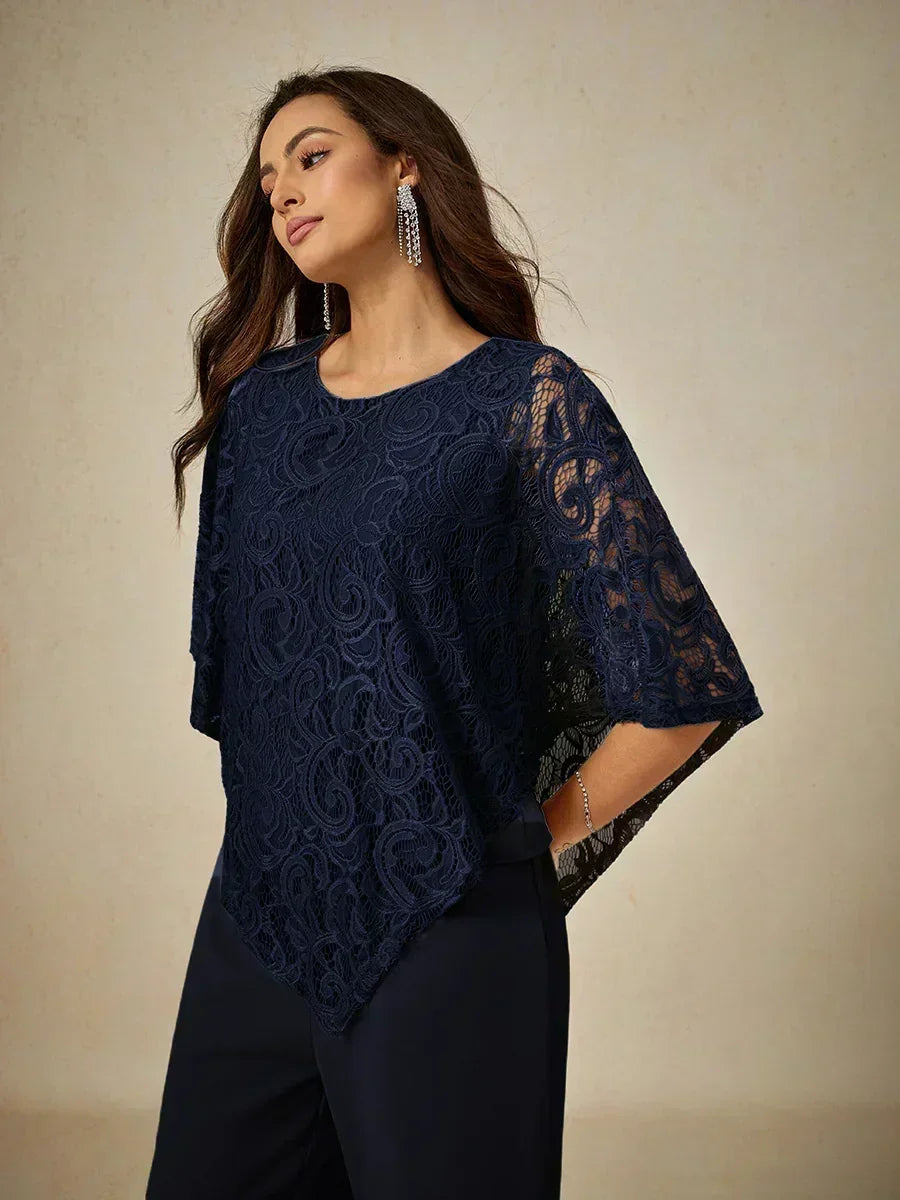 這款輕盈蕾絲上衣採用寬鬆剪裁,配有蝙蝠袖半袖及精緻的蕾絲圖案。設計上採用經典的圓領與寬鬆版型,兼具舒適與優雅。清新的色調非常適合春夏季節,無論搭配同色褲裝或休閒造型皆宜。理想用於日間外出、休閒聚會或半正式場合