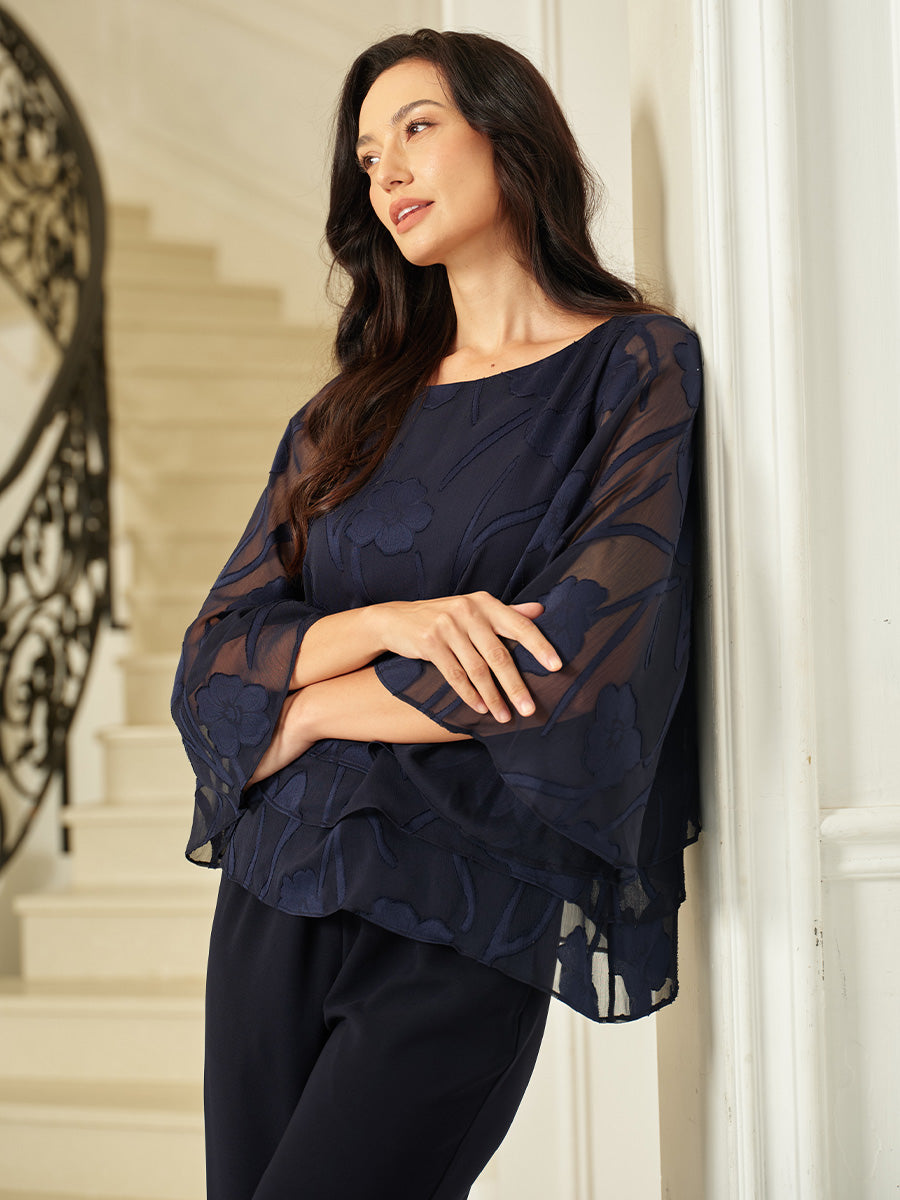 寬鬆剪裁,圓領,披肩式層疊袖,花卉細節,展現優雅女性輪廓 -