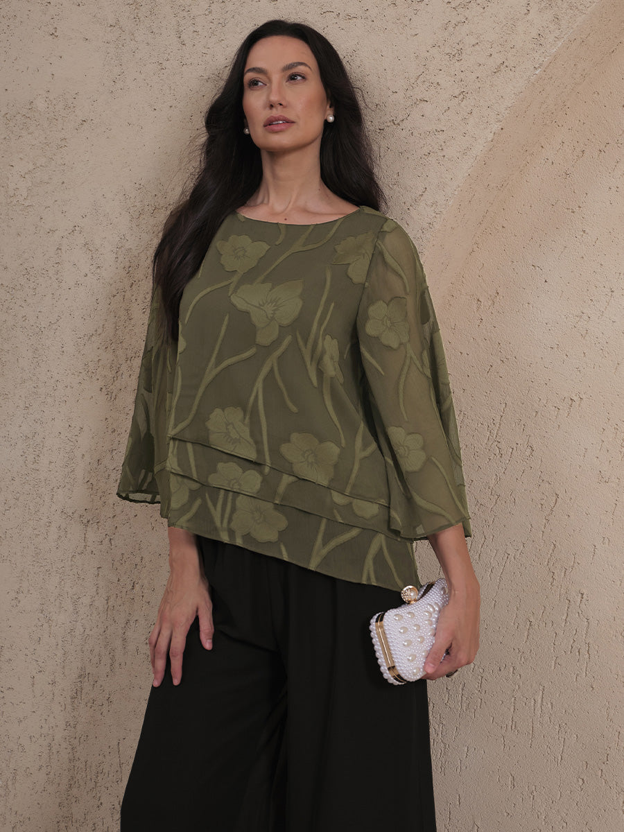 Floral Chiffon Boat Neck Blouse with A-Line Sleeves