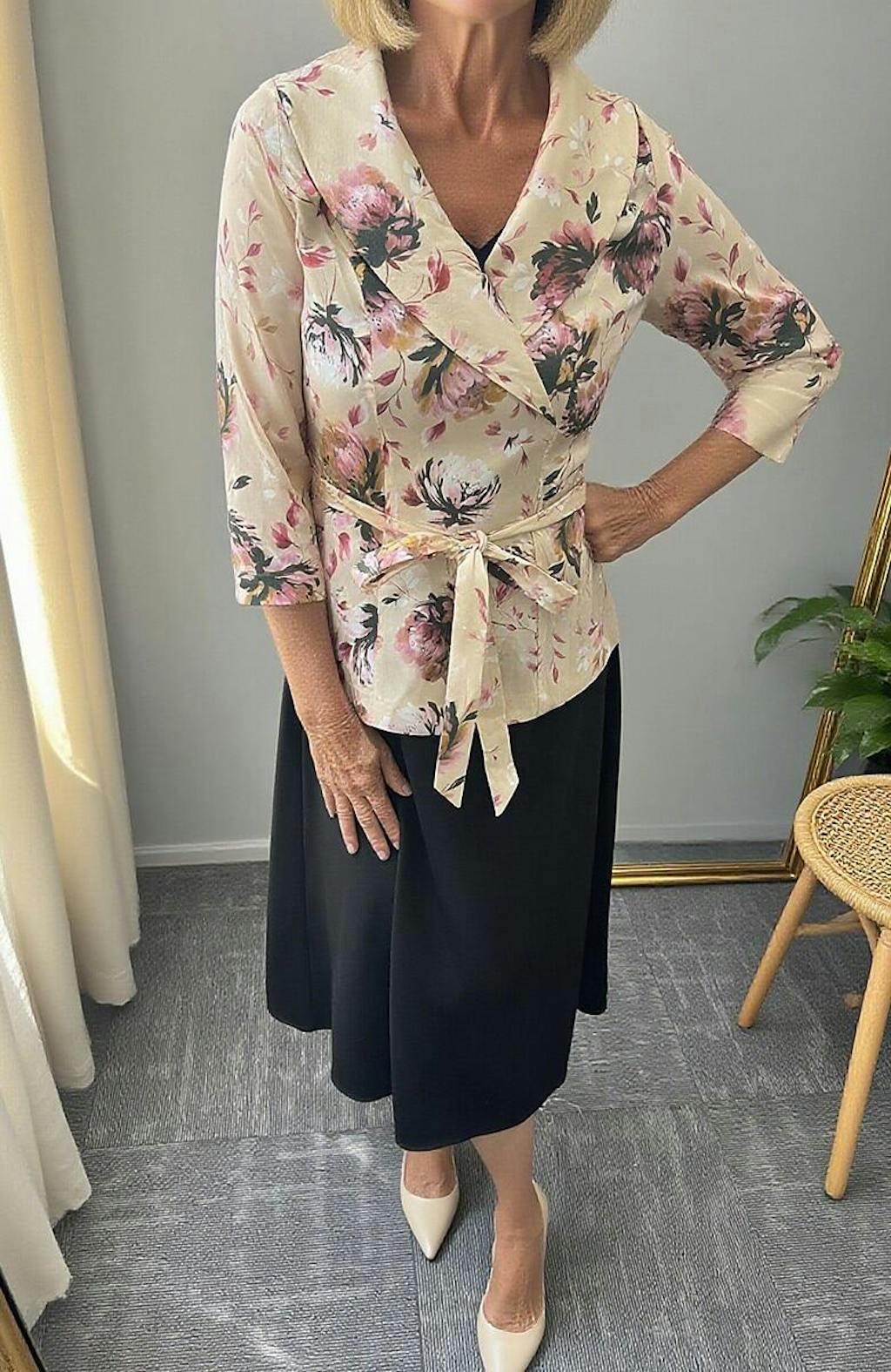 Make a refined statement with this elegant 3/4 sleeve stretch taffeta blouse. Designed with an asymmetric silhouette, this top features a structured collar, a stylish tie-front waist detail, and a hidden back zipper for a smooth fit. The stretch fabric offers comfort without sacrificing shape, making it perfect for special occasions and elevated evenings.