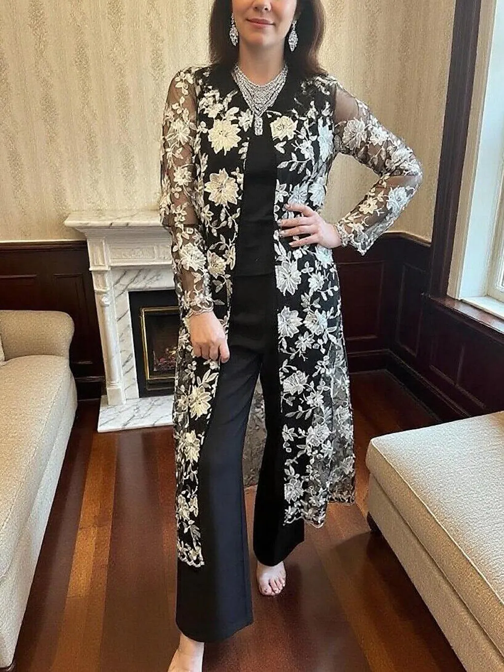 七分長直筒褲搭配雪紡開衩褲腿罩衫