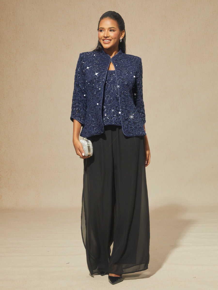 The craftsmanship is exquisite, and the sequins are so sparkly. This jacket and vest set is hard to find in this style. Although it's a bit pricey, I got a discount when I paired it with pants.